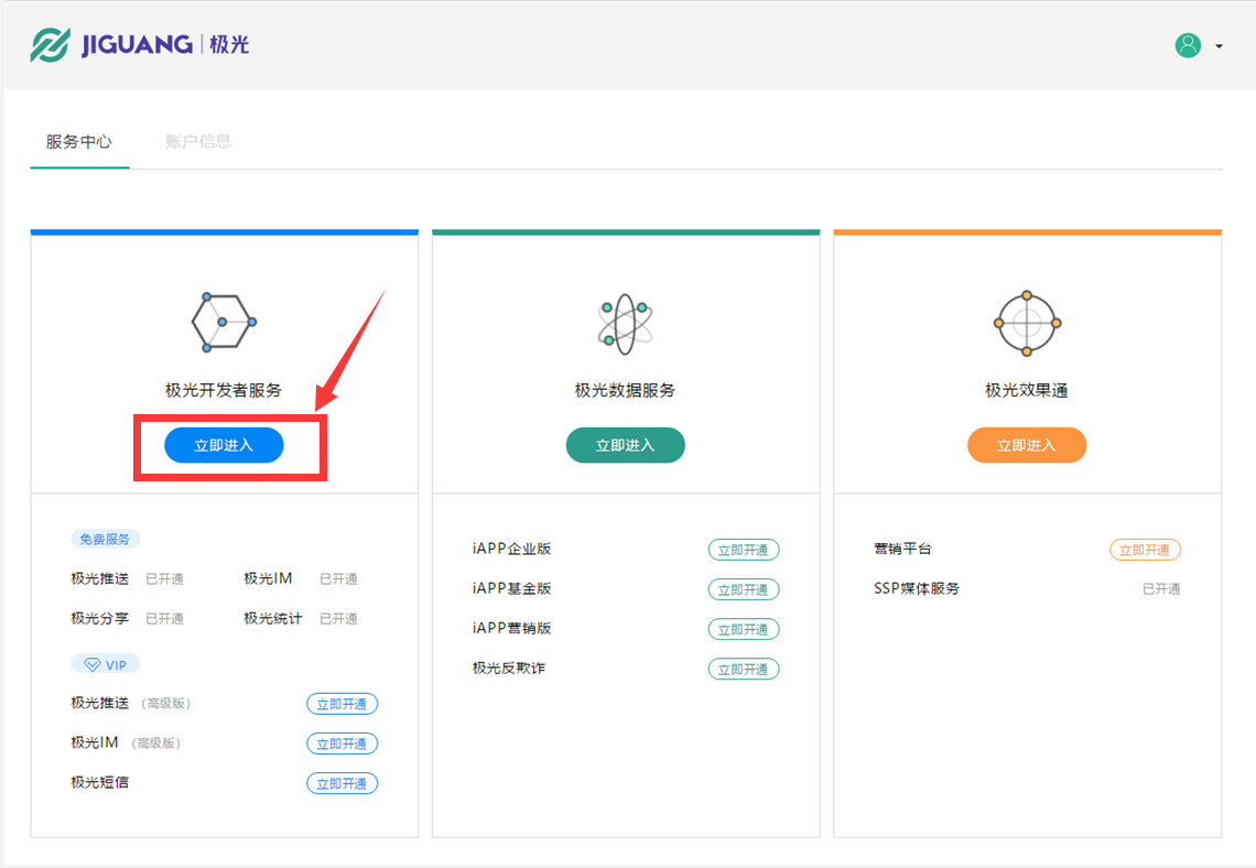 1. 进入服务中心,可以在顶部导航栏【开发者服务】——【极光推送】中,进入以下页面;