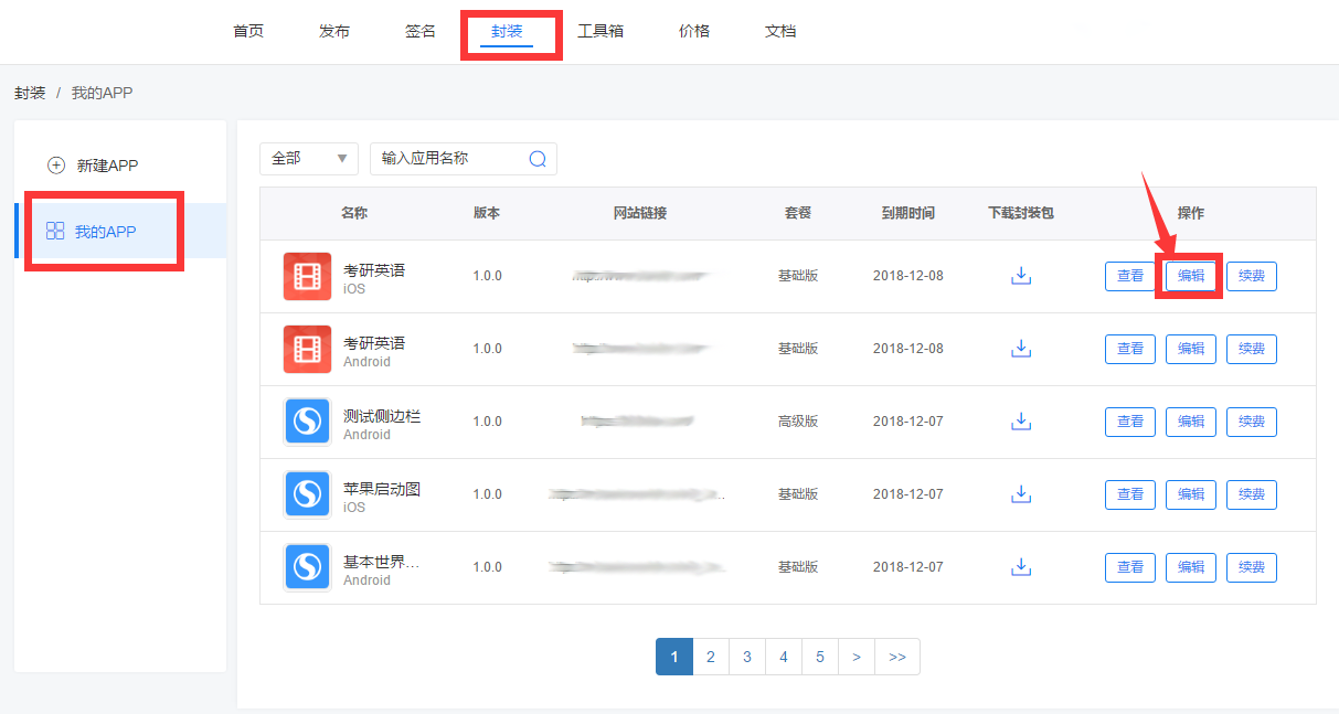 第六步  登录平台网站,在【封装-我的APP】中选择,需要编辑极光推送的APP,点击编辑,以APP【考研英语】为例。