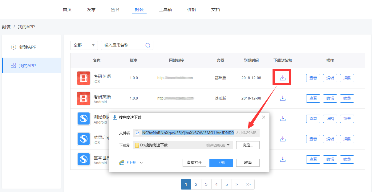 在【封装-APP详情页】如下图所示:点击测试下载链接,进行测试安装。